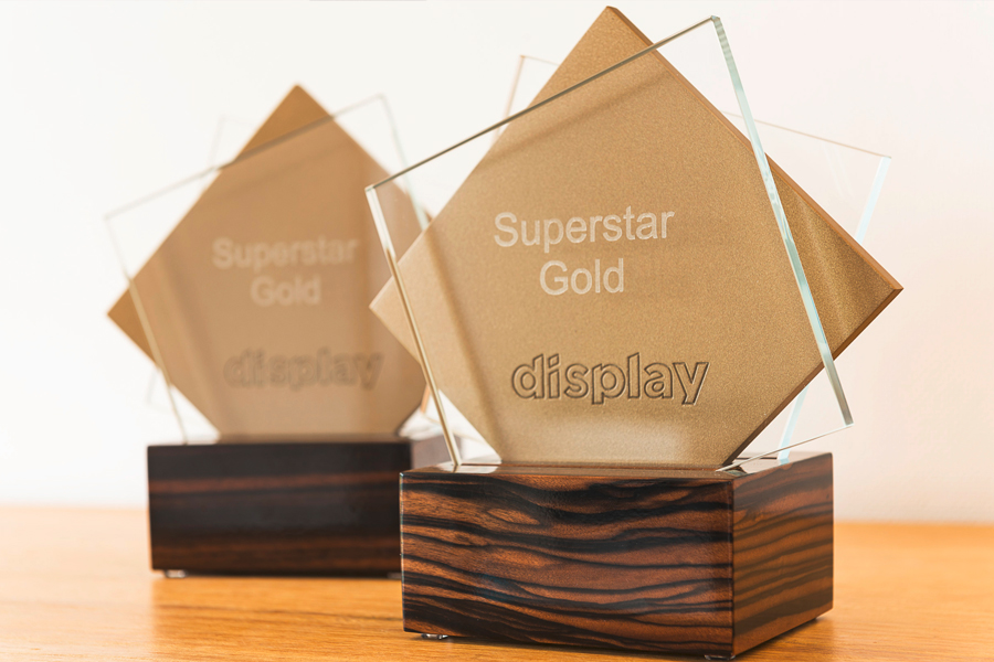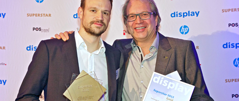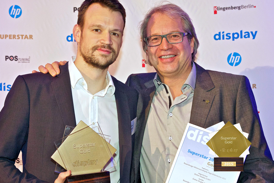 Wir freuen uns sehr über gleich zwei Preise für unser Ravensburger Mittelraumdisplay: den SUPERSTAR Award 2015 in Gold in der Kategorie "Holz warentragend" sowie den SUPERSTAR Award 2015 in Gold, Sonderpreis "Design". Seit 1994 vergibt der display Verlag den SUPERSTAR Award, der inzwischen zu den renommiertesten in der Werbe- und Marketingbranche gehört.