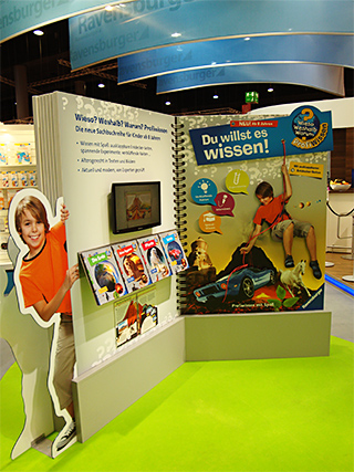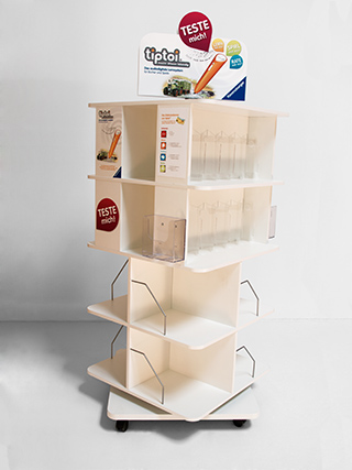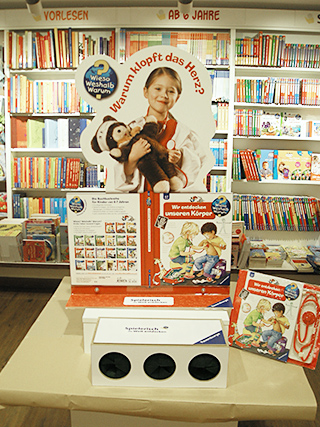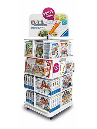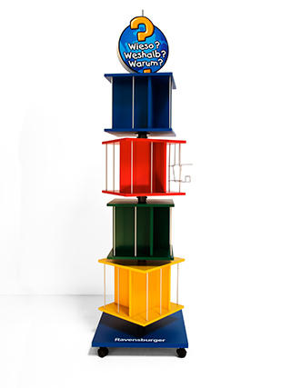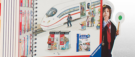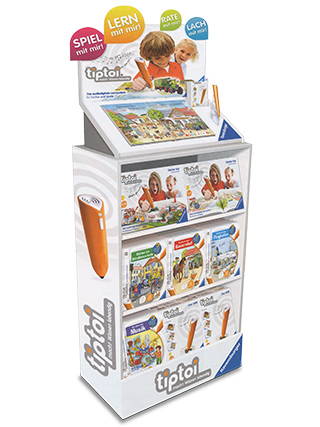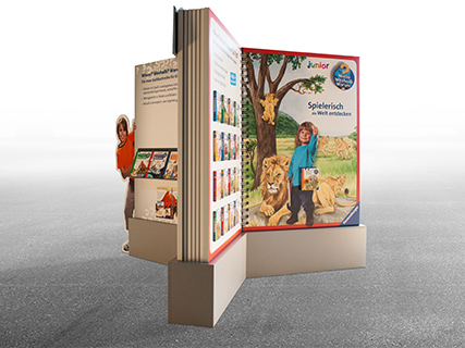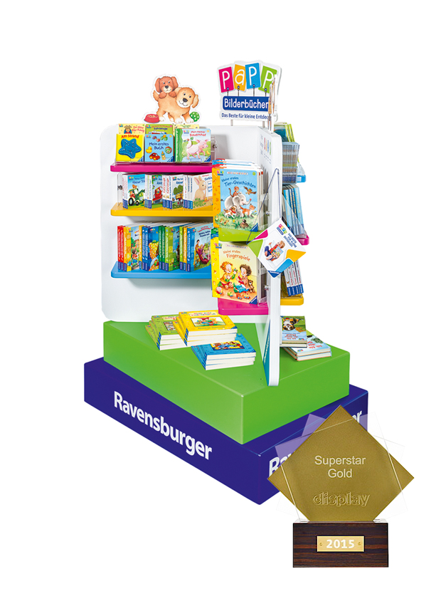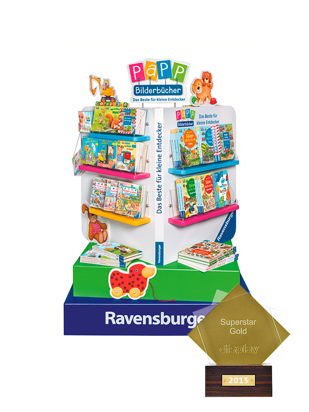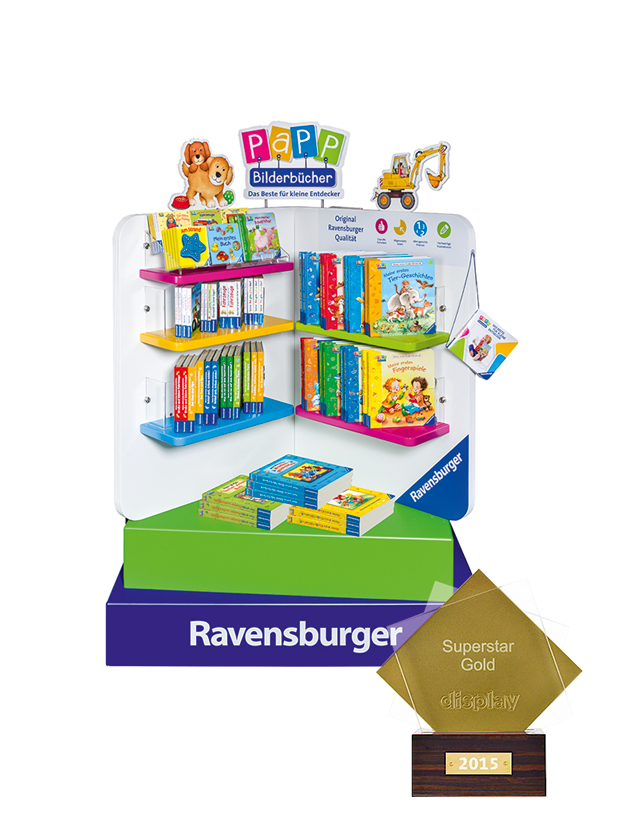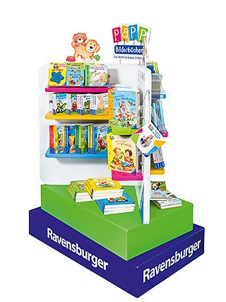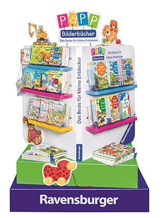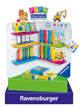 "Fühlen, Spielen, Entdecken und die Welt mit allen Sinnen ein bisschen mehr begreifen" – diese Grundidee von Ravensburger galt es auf ein warentragendes Display zu übertragen. Zunächst wurde das Designkonzept nach Gesichtspunkten des Neuromarketings ausgearbeitet und visualisiert. Die überdimensionale, plakative Darstellung eines Pappbilderbuchs, die gute Fernwirkung und die perfekte Griffhöhe bieten für Eltern und Kinder ab sechs Monaten einen haptischen Einstieg in die Welt der Bücher. Bewegliche Elemente am Display fördern den Entdeckertrieb zusätzlich. Das Display greift zur besseren Orientierung den Farbcode der Pappbilderbücher auf, bietet viel Platz zur Darstellung des breiten Sortiments und liefert gleichzeitig Fläche zur Kommunikation der Marke Ravensburger.